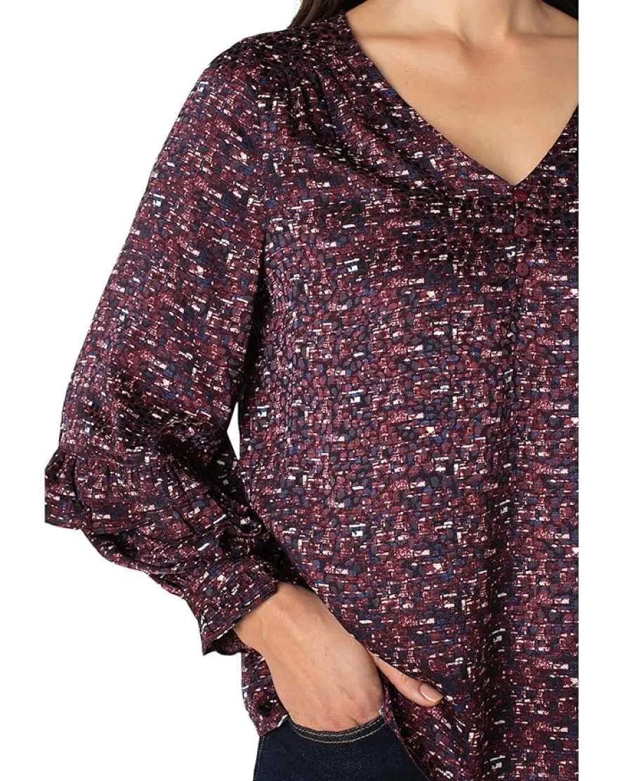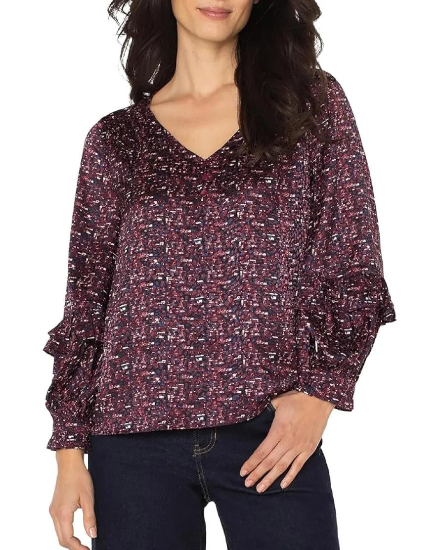 - The Liverpool™ Los Angeles Long Sleeve Woven Blouse W/ Ruffles make a striking statement with its multi print pattern, elegant and designed to be uniquely yours. Designed with a V-neck, three front buttons, and subtle ruffles on the sleeves, it drapes effortlessly whether worn tucked, untucked, or layered under a jacket. Sleek enough for the office, bold enough for after hours.