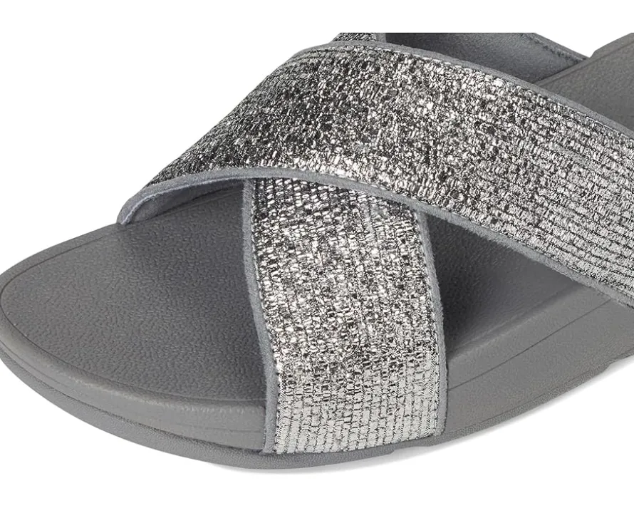 - The FitFlop™ Lulu Crinkled-shimmer Cross Slides are the classics. Perennially popular, they’re softly padded, foot-flattering, and on FitFlop’s Microwobbleboard™ midsoles for unbeatable all-day comfort. This season, crafted in a glittering crinkled-foil polyurethane upper, these slides are an irresistible mix of shimmer and texture. They are styled with tonal piping. Their rubber insole and polyester lining offer added comfort. These slide sandals are ergonomically engineered to help optimize your body’s alignment, natural movement, & energy. APMA-accepted, they offer natural arch support and are grip-suited to everyday use/road tread. Simple but glitzy, these slip-on sandals are equally good whether you’re doing daytime glamour or headed to a party.