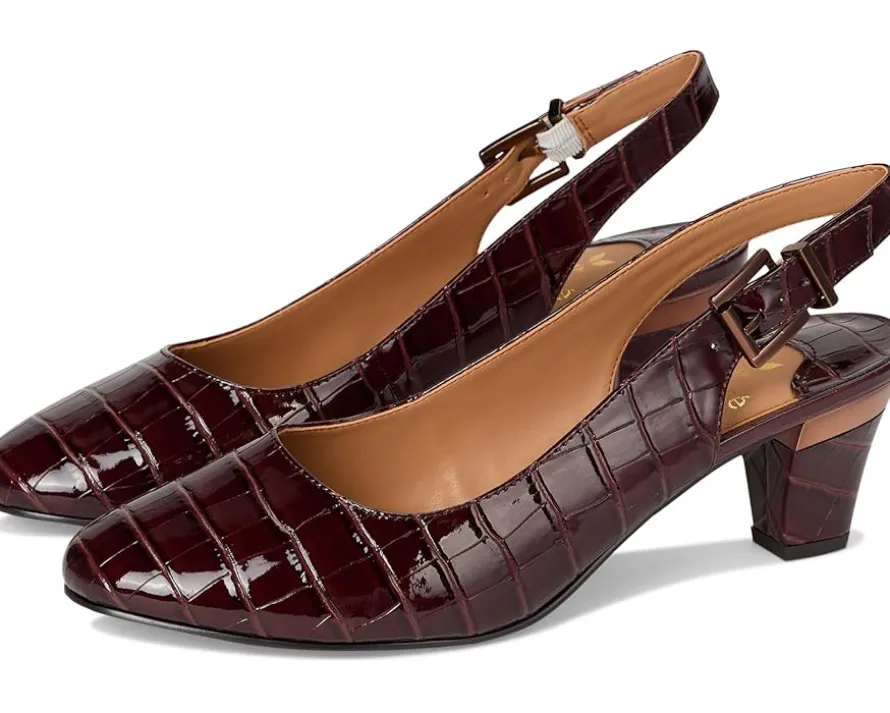 - The J. Renee® Malree is a year-round staple that blends classic sophistication with comfort-focused design. Featuring a croco-embossed almond toe, it’s crafted with a polyurethane upper and lining, and set on a block heel for subtle elevation. The buckle adjustable slingback strap closure ensures a secure fit, while the memory foam + latex insole provides cushioned support for all-day wear.