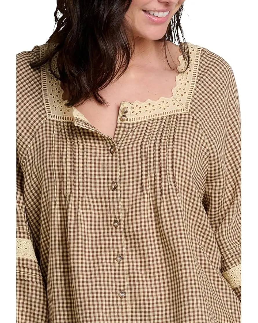 - Lace trim and pintuck detail at neckline and sleeve.