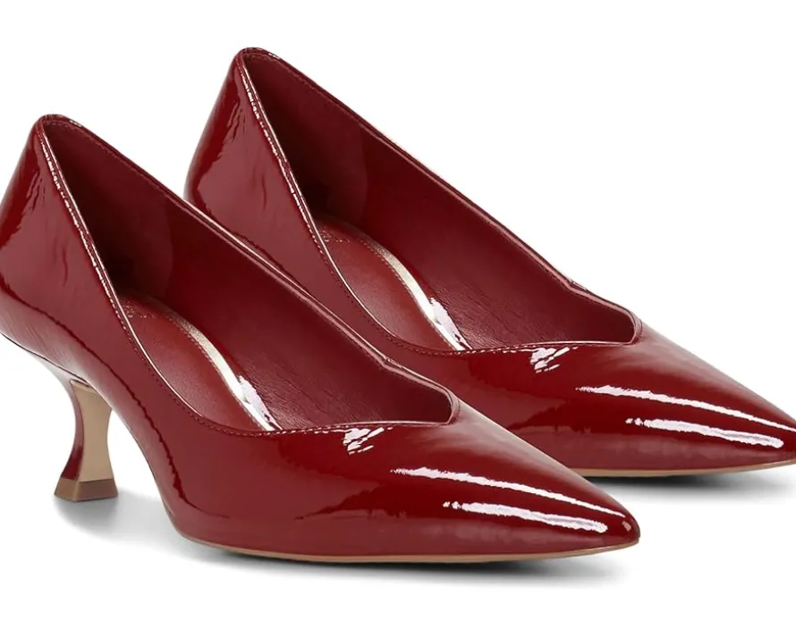 - Upgrade your desk-to-dinner style with an extra dose of shine and sophistication donning the Vince Camuto® Margie Heels. Displaying a pointy toe coupled with a covered kitten heel, these classic pumps feature a leather upper with a flattering V-shaped opening, a soft faux leather lining, and a cushioned EVA insole.