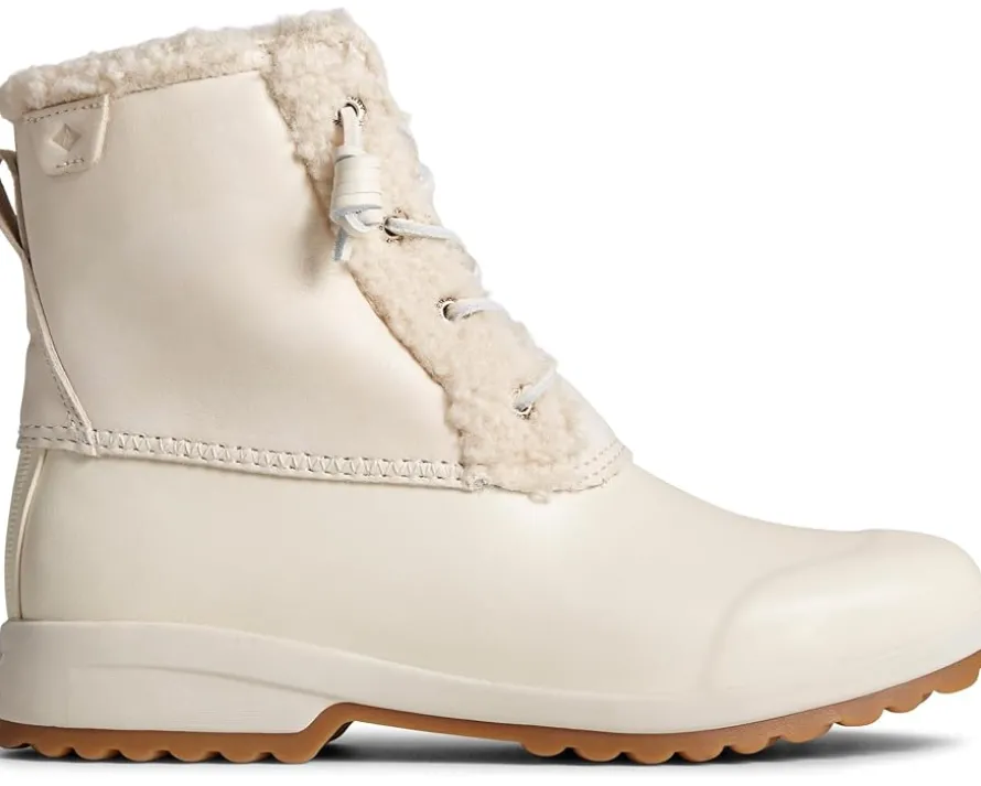- Stay on your toes throughout the day with comfort and coziness wearing Sperry® Maritime Repel Teddy Trim Boots. The boots are designed to provide warmth and come with a round toe shape, lateral zip & lace detailing for adjustability, and a block heel. These are engineered with a leather and synthetic upper, textile lining, and textile insole.