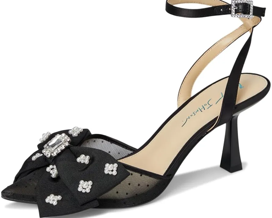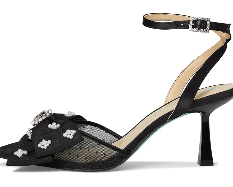 - Step into style donning the Blue™ by Betsey Johnson MARK! This pointed-toe mesh heel features a unique rhinestone bow detail, adding a touch of edgy playfulness. Completed with a secure ankle strap, these heels will elevate any outfit while keeping you comfortable. Made from faux leather upper, polyester lining, and polyurethane insole.