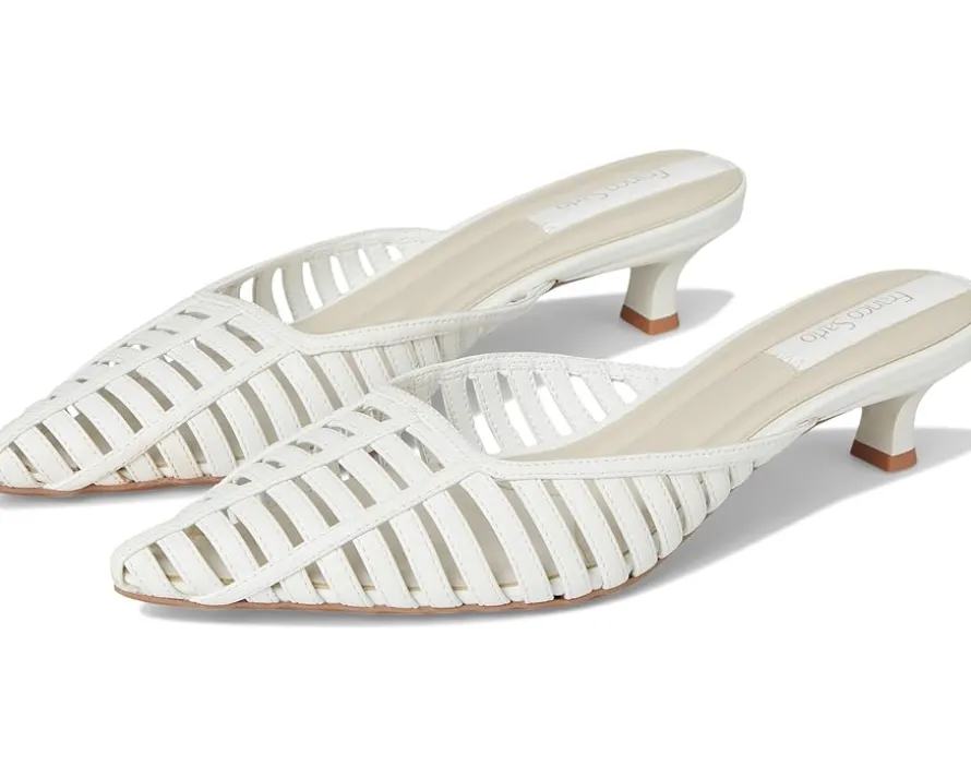 - The intricate leatherwork highlights a stunning design of Franco Sarto® Marlina, complemented by the perfect kitten heel for a touch of sophistication. Made with high-quality faux leather upper, these slip-on sandals offer a stylish option for your wardrobe.