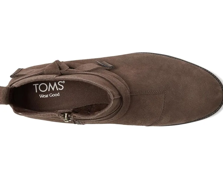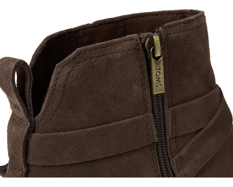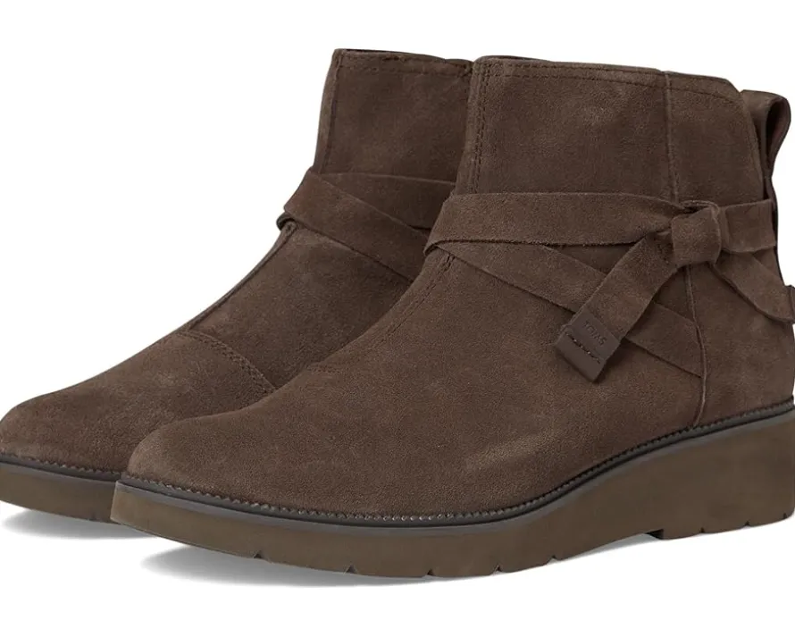 - Find the perfect addition to your fall weather wardrobe in the TOMS® Marlow booties. Featuring a suede upper, polyester lining, polyurethane insole, a medial zipper and pull tab for easy on and off, and a decorative wrap around strap with a low wedge heel.
