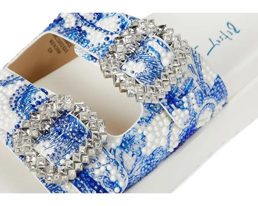 - Meet the Blue™ by Betsey Johnson Matie, the slip-on statement sandal designed to elevate your everyday with effortless flair. Crafted with a sleek PU upper and soft PVC lining, this style pairs bold beauty with lasting comfort. The faux leather insole features a contoured footbed that supports your stride, while the rubber outsole ensures confident traction from sunny sidewalks to weekend strolls. A chic platform heel adds instant height without sacrificing ease, and the breezy open toe keeps every step fresh and fun. Finished with a stunning floral design, the Matie sandal delivers the perfect balance of whimsical charm and casual cool.