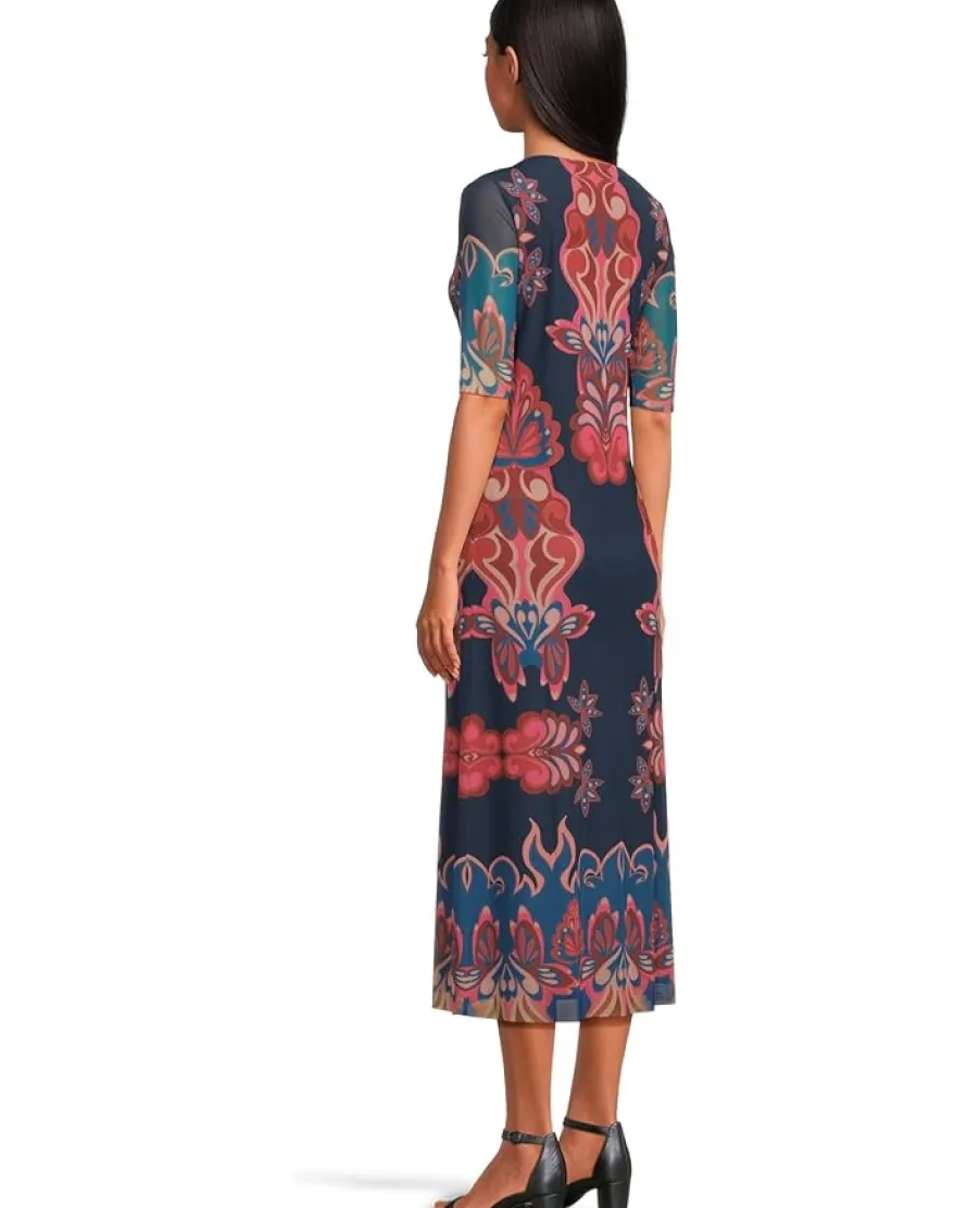- The Johnny Was® Maya Mesh Midi Dress is a fitted, midi-length dress featuring a scoop neckline and elbow-length sleeves. It is adorned with a bold and symmetrical floral pattern in rich red, orange, and blue hues set against a deep navy background. The placement of the pattern draws the eye vertically, creating a slimming and elongating effect. This printed dress features a mesh fabrication offering comfort and breathability. Make your fashion statement wearing this Midi dress.