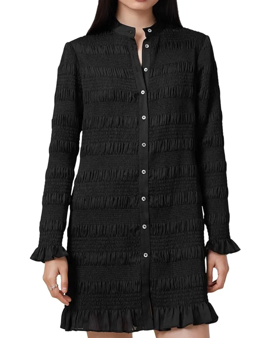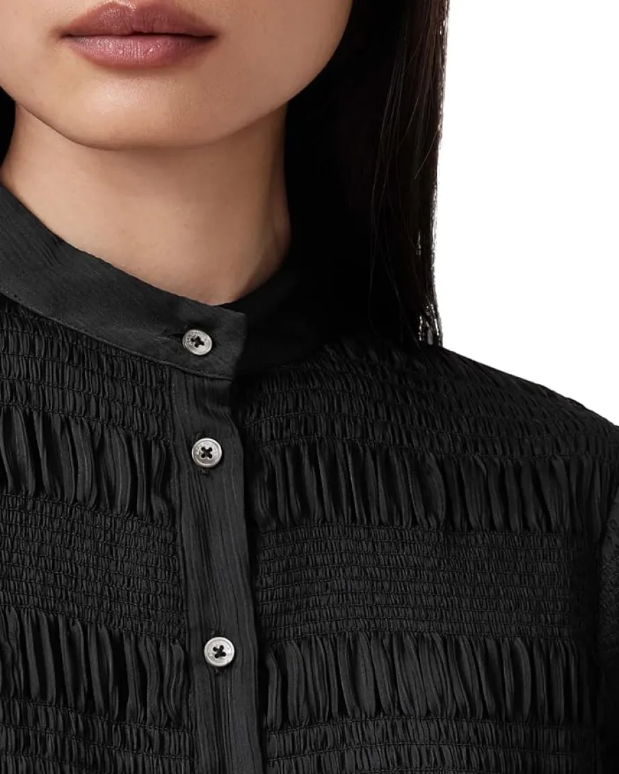 - Slay all-day, everyday wearing the stylish AllSaints™ Meg Mini Dress. Abundant pleats and ruffles bring eye-catching dimension to this long-sleeve minidress. Featuring front button closure, band collar neckline, and long sleeves with smocked cuffs.