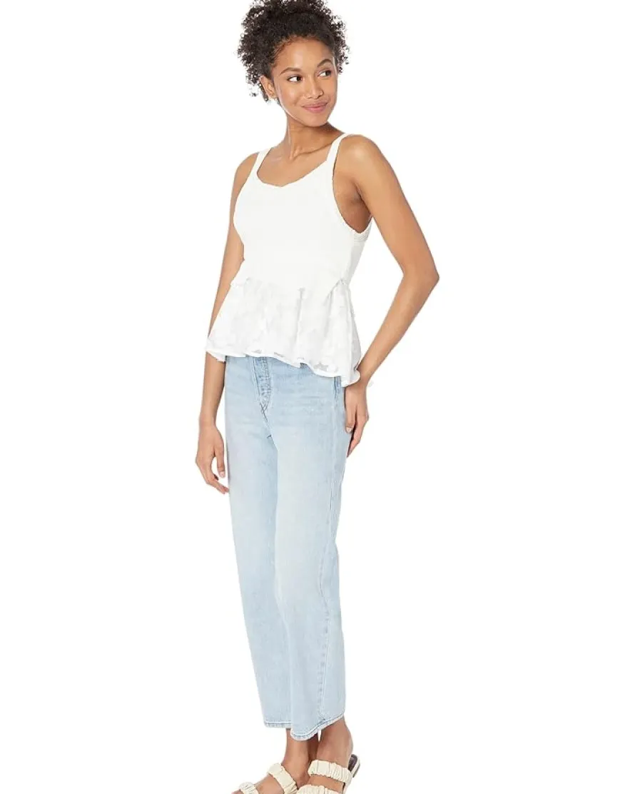 - Textured bodice with straight neck, shoulder straps, and ribbed hem.