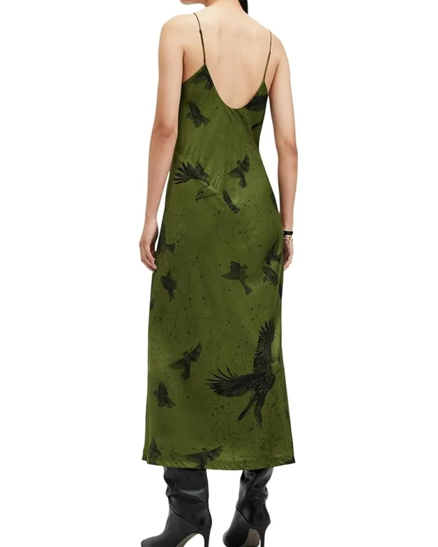 - Stand out in style wearing the AllSaints™ Melody Dress. Crafted from a silk blend fabric, this dress features sleeveless style, V-neckline, midi length silhouette, seams under bust, angled side split, and new season marea print.