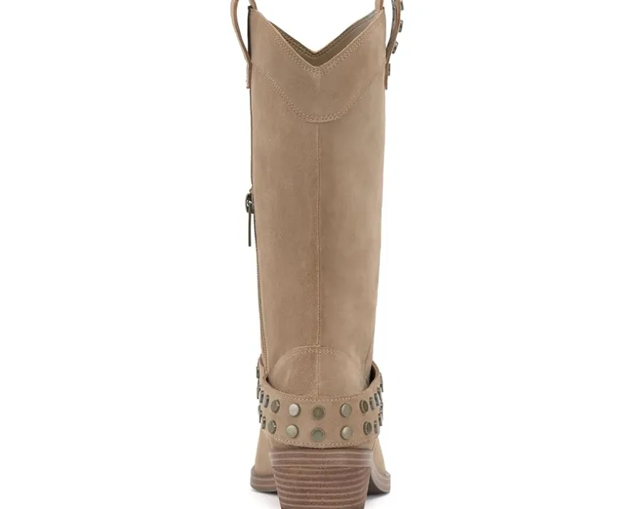 - This mid-calf western inspired boot comes in rich leather and silky suede. With traditional pull straps adorned with circular hardware and extended welt with metal tip to protect the toe, the boot also has a less traditional belt detailed with hardware and inside zip for easy entry. With a flattering curved topline, the boot sits on a stacked 1.4 in heel.