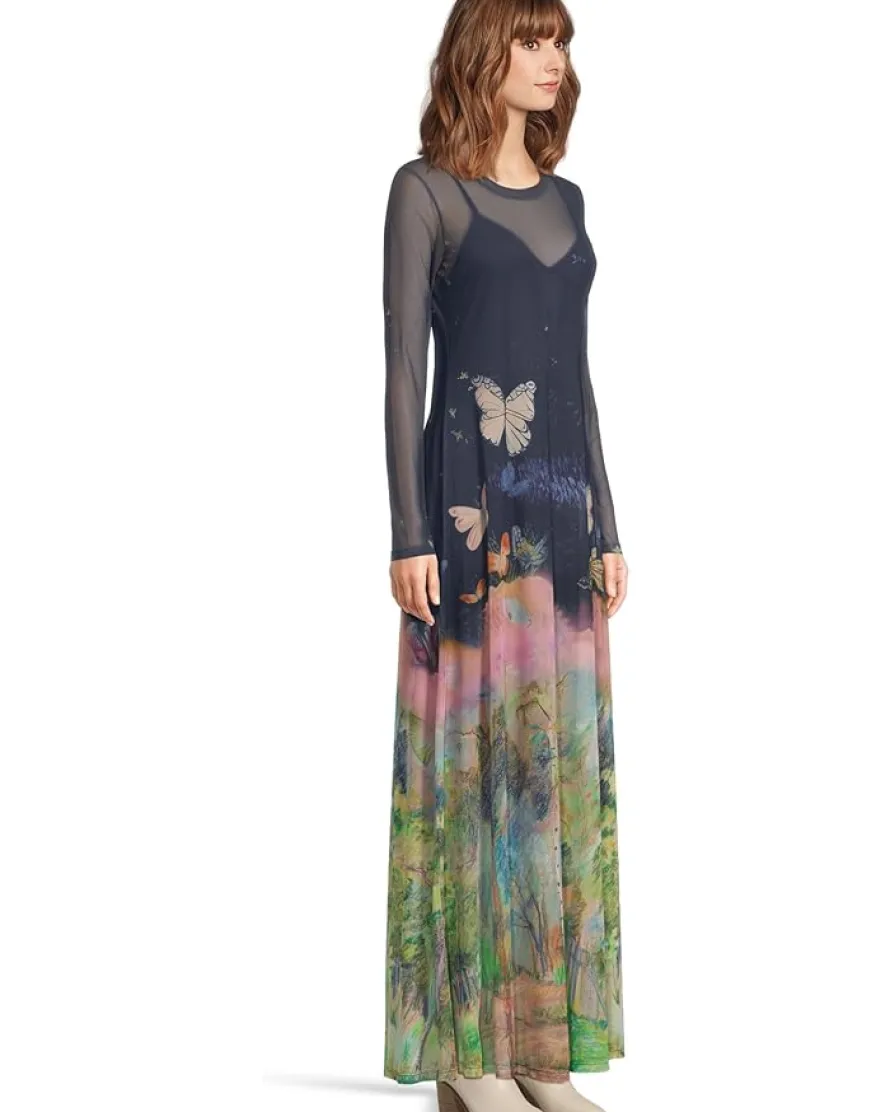 - A sheer, butterfly-kissed maxi dress that’s equal parts dreamy and enchanting. Featuring a crew neckline with long sleeves, straight hem and a pull-on style.