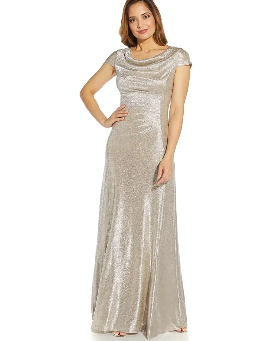- Look graceful in this alluring yet sophisticated, a showstopping Adrianna Papell® Metallic Knit Drape Neck Gown, designed in a soft and shimmering metallic foil. It is every bit stunning from the drapped neckline to the floor-grazing hem. It features ruched detailing along the waist for added texture and dimension.