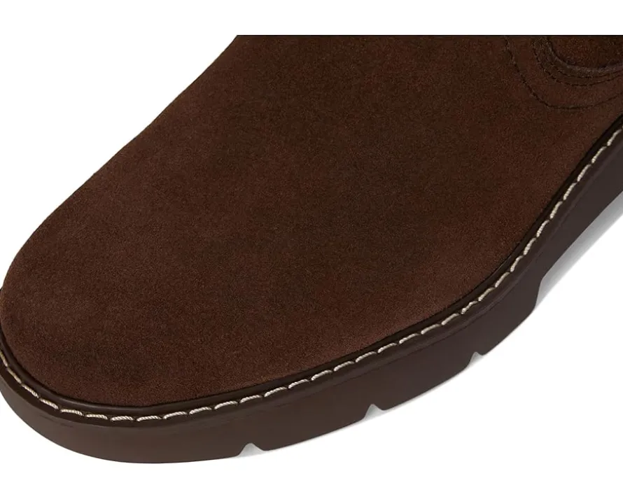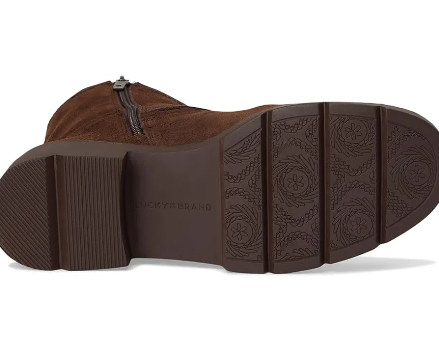 - A moto boot classic look in leather! The Lucky Brand® Migyn Double Buckle Moto Boots feature a double buckle detail, rubber outsole, leather upper, chunky block heel and zippered side closure.