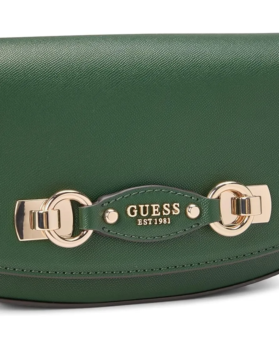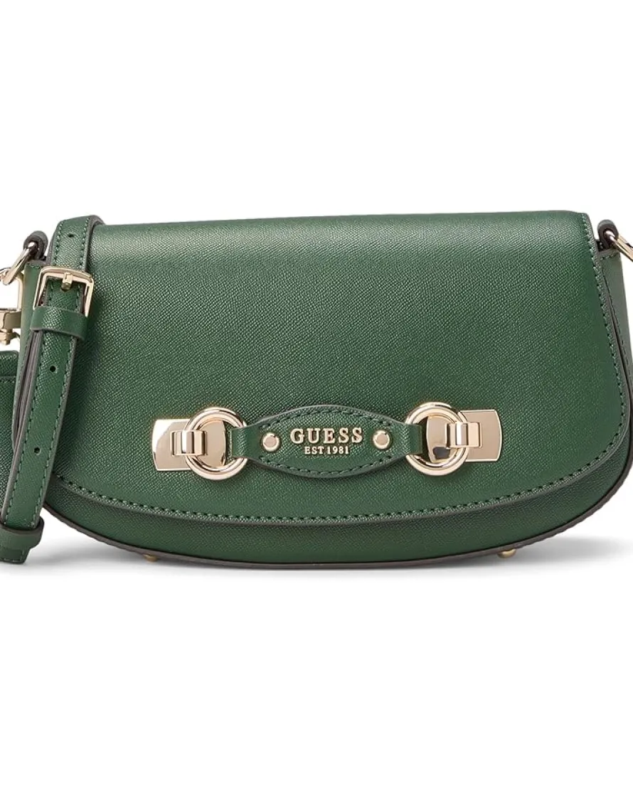- The GUESS® Mimina Flap Crossbody in eco pebbled PU is designed with an adjustable crossbody strap and shiny gold hardware. The zippered interior pocket, six card slots, and a zippered exterior back pocket can store your cards, money, and small items. Its magnetic closure offers easy access. This compact crossbody purse is an ideal choice to complement your casual outfits and dresses.