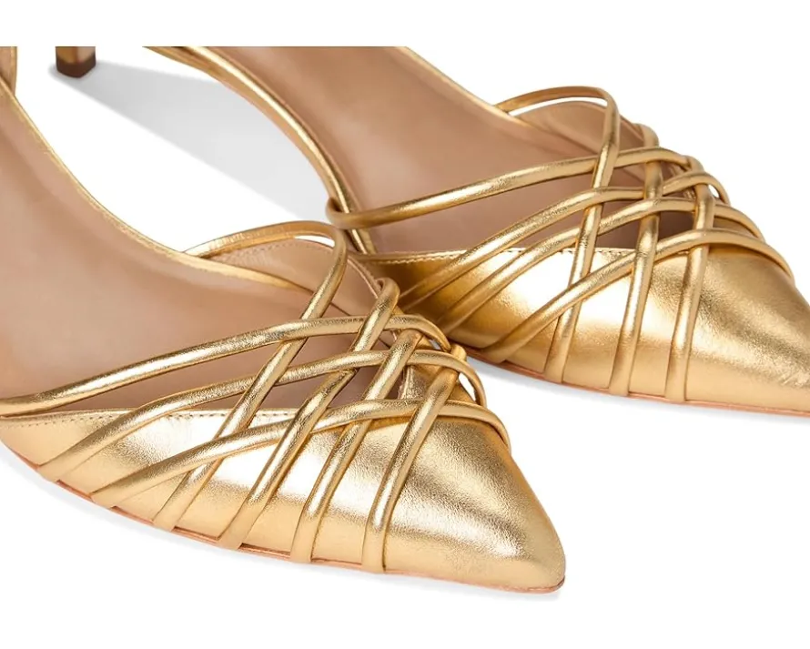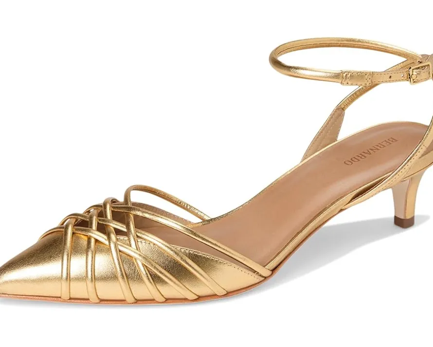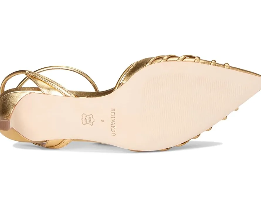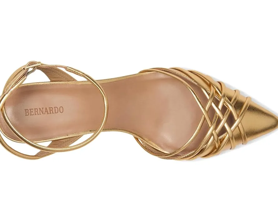 - Flattering lines, standout shine. The Bernardo® Minu sandals feature delicate, intertwining straps that create a sleek, flattering silhouette. They are designed with a leather upper, insole, and lining. The ankle strap with an adjustable closure ensures a secure fit. These heeled sandals are styled in a monotone metallic design to elevate your look with some texture and dimension.