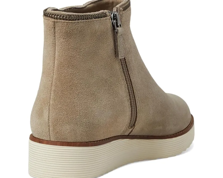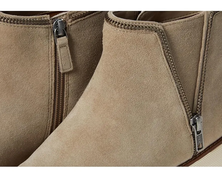 - Charm meets elegance with this Johnston & Murphy® Mitzi Zipper Bootie featuring a low-top profile and soft almond toe silhouette. The footwear has suede upper construction with skeletal leather and microfiber lining, and cushioned, leather-covered footbed for all-day comfort.