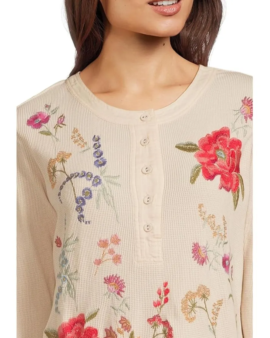 - Crafted from a polyester and cotton blend, the Johnny Was® Mixed Media Henley Thermal keeps you cozy and warm in the cold weather. Featuring bold placement embroidery in vibrant colors, this Henley top is styled with long sleeves, a Henley neckline, and a straight hem. Its half-buttoned front placket ensures easy wear. This half-button Henley makes a great addition to your wardrobe.