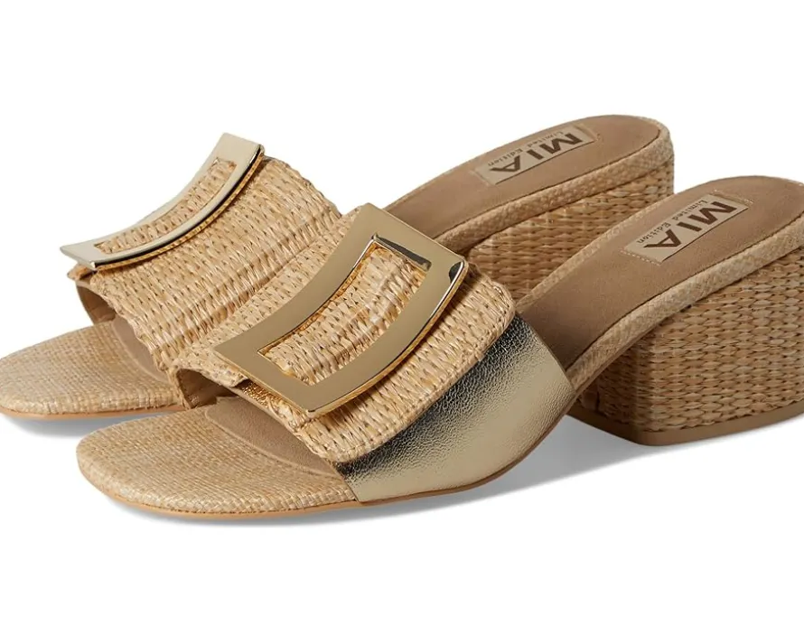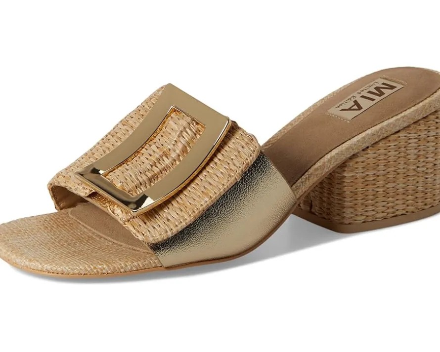 - Give a flirty twist to your feet by styling MIA™ MLE-Idania. These sandals feature a metallic leather upper that catches the light and eyes alike. The open-toe design adds breezy charm, while the raffia-wrapped block heel gives a playful lift that’s comfy and stylish. A striking statement buckle detail enhances the look which makes it a head-turning choice for brunch dates, rooftop hangs, or spontaneous getaways. Finished with a smooth faux leather lining, insole, and outsole, they’re designed for easy, all-day wear.
