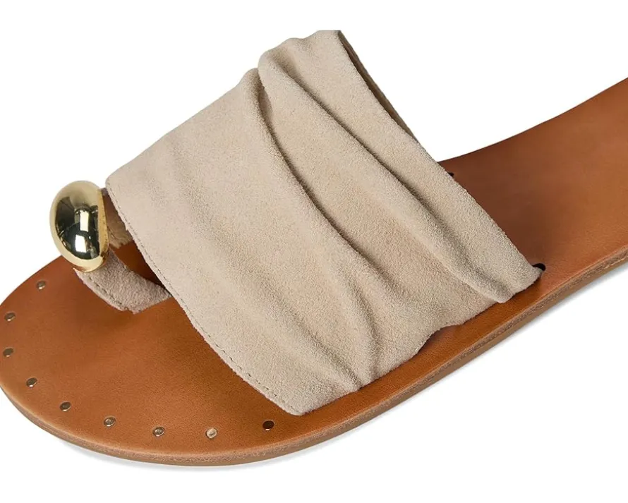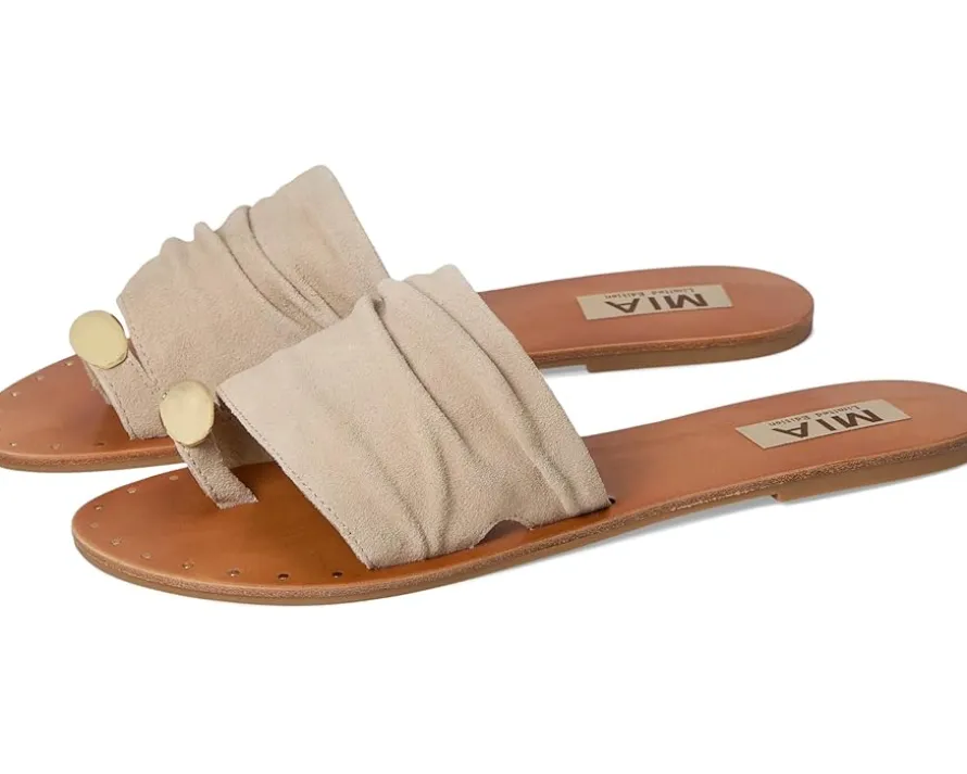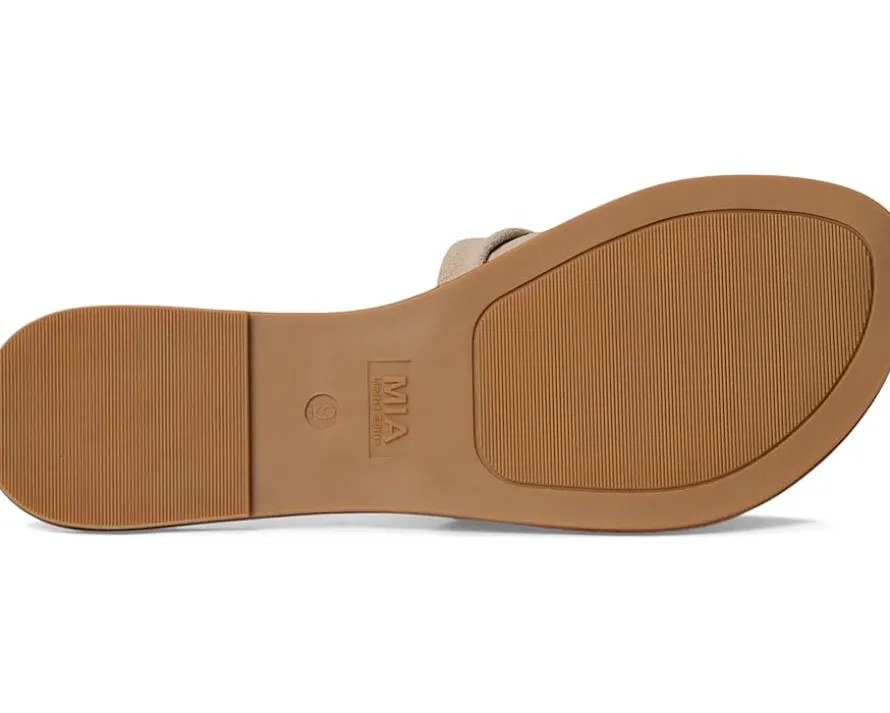 - Liven up your laidback look in the MIA™ MLE-Tiffani sandal. Featuring a genuine suede strap, flexible faux leather lining, nail head details, and a toe ring accent for a touch of glam.