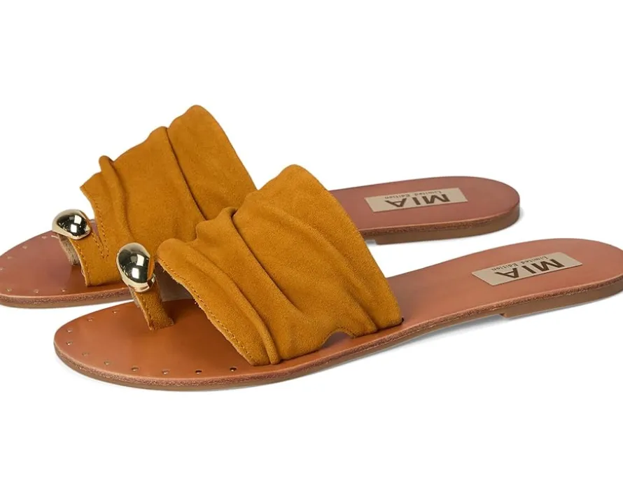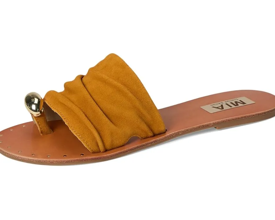 - Liven up your laidback look in the MIA™ MLE-Tiffani sandal. Featuring a genuine suede strap, flexible faux leather lining, nail head details, and a toe ring accent for a touch of glam.