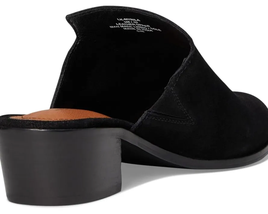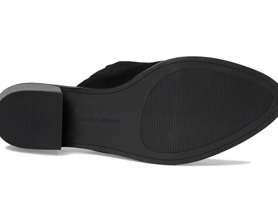 - Beyond the basic slide Lucky Brand® Myrila. With its rich suede upper and natural stacked block heel, this slide delivers timeless style with a modern twist. The clean leather silhouette effortlessly complements everything from denim to dresses, making it your ultimate wear-anywhere, style-anytime shoe. A comfy faux leather lining and insole offer all-day ease, while the durable rubber outsole keeps every step steady. Just pull on and go – no fuss, all fashion.