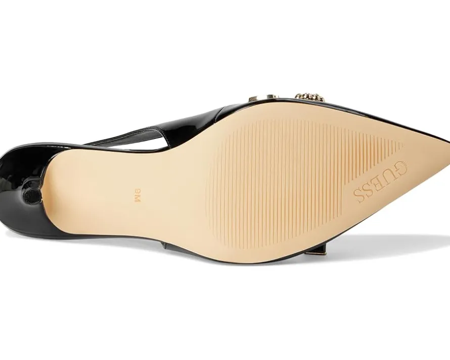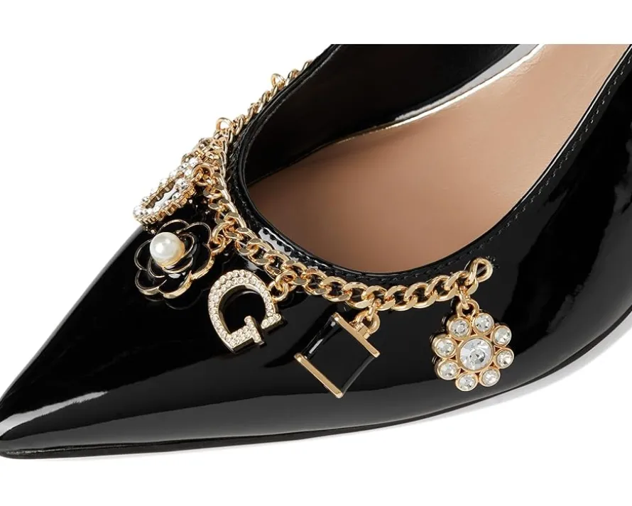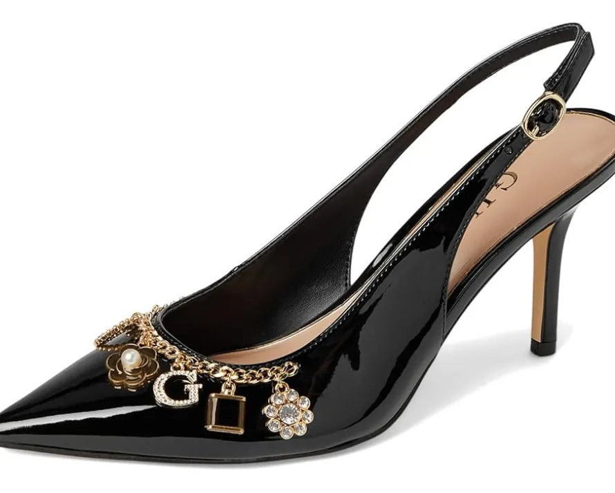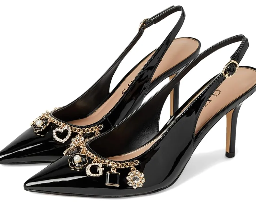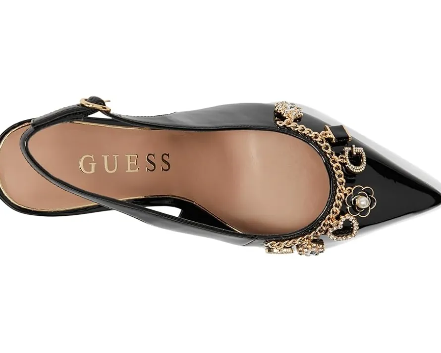 - The GUESS® Gwnaska heels are classic pointed-toe-shaped slingback pumps that get a charming touch. These heeled pumps are made of a polyurethane upper, cushioned insole, and synthetic rubber lining. They are accented with a chain with GUESS® charms hanging from it. Chic and classy, these pump shoes are perfect to style up your looks and outfits.
