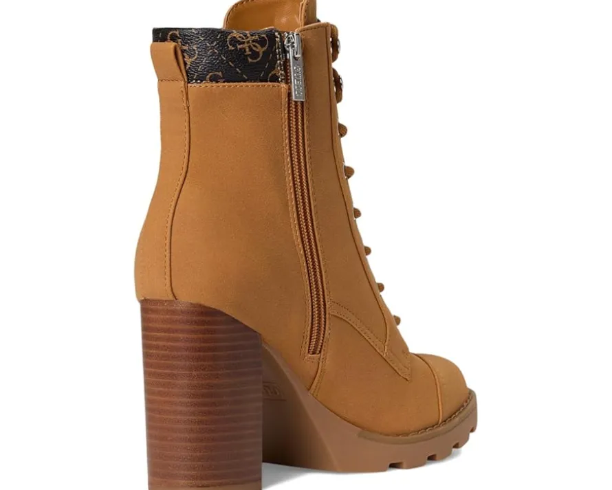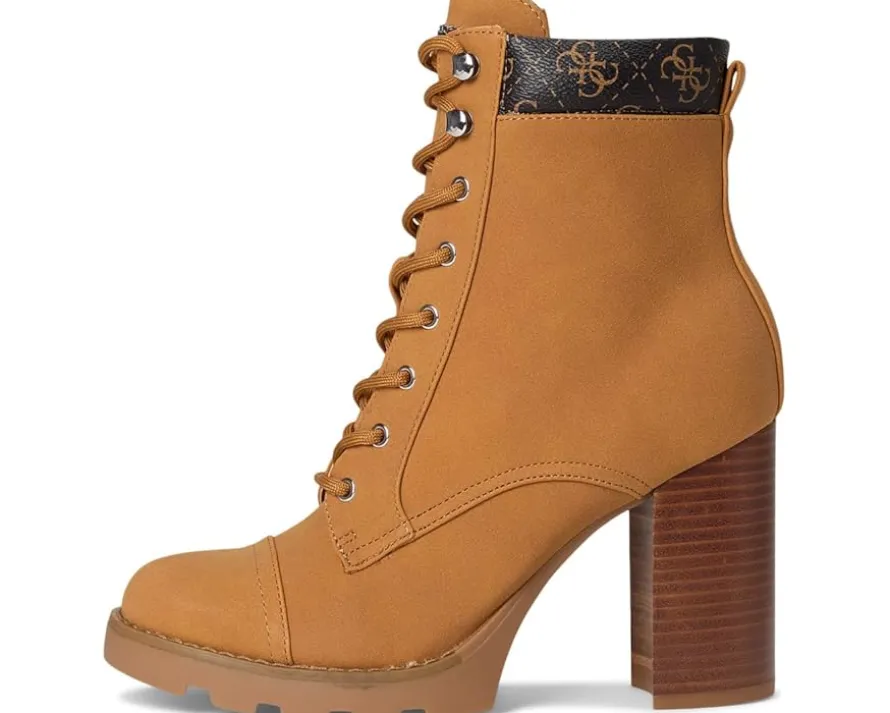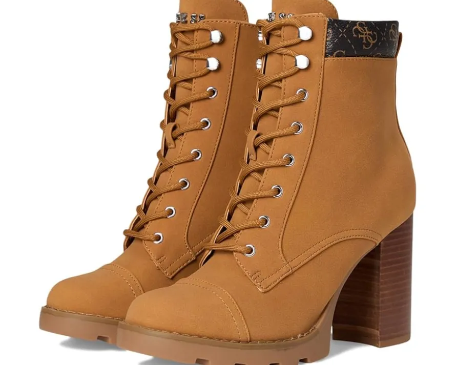 - The Nellsan bootie from Guess® offers a tailored look on a sturdy block high heel. The heeled, lace up combat bootie is a classic look with a modern feel.