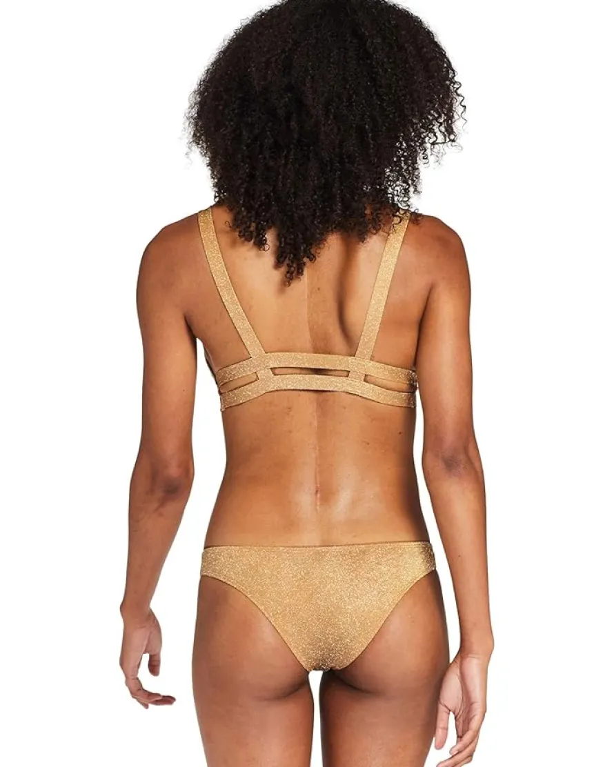 Golden Glow Metallic: 68% recycled nylon, 19% lycra, 13% metallic fiber. - Hand wash cold, lay flat to dry.