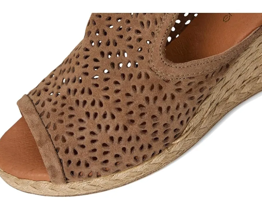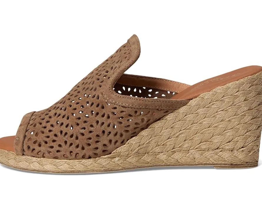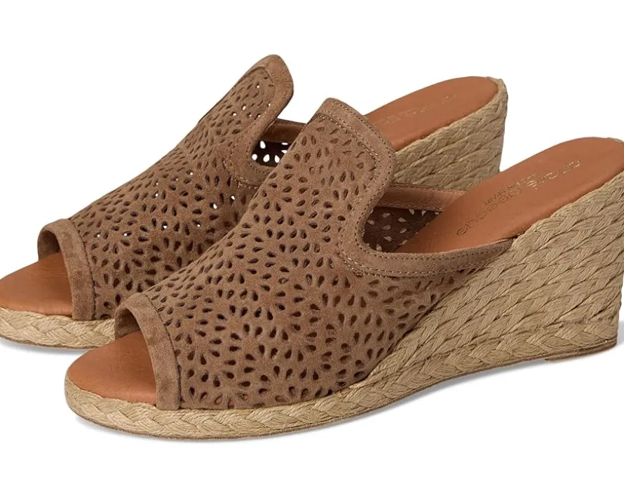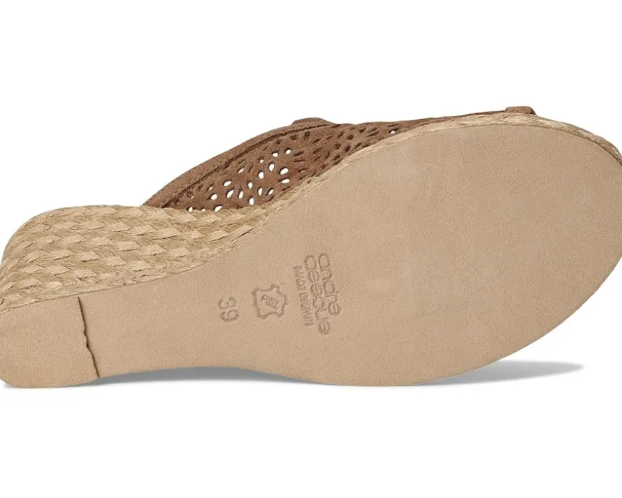 - The Andre Assous™ Nissa sandal features perforated suede upper and a slip-on design. With a raffia-wrapped wedge heel, its interior is lined with suede for all-day comfort.