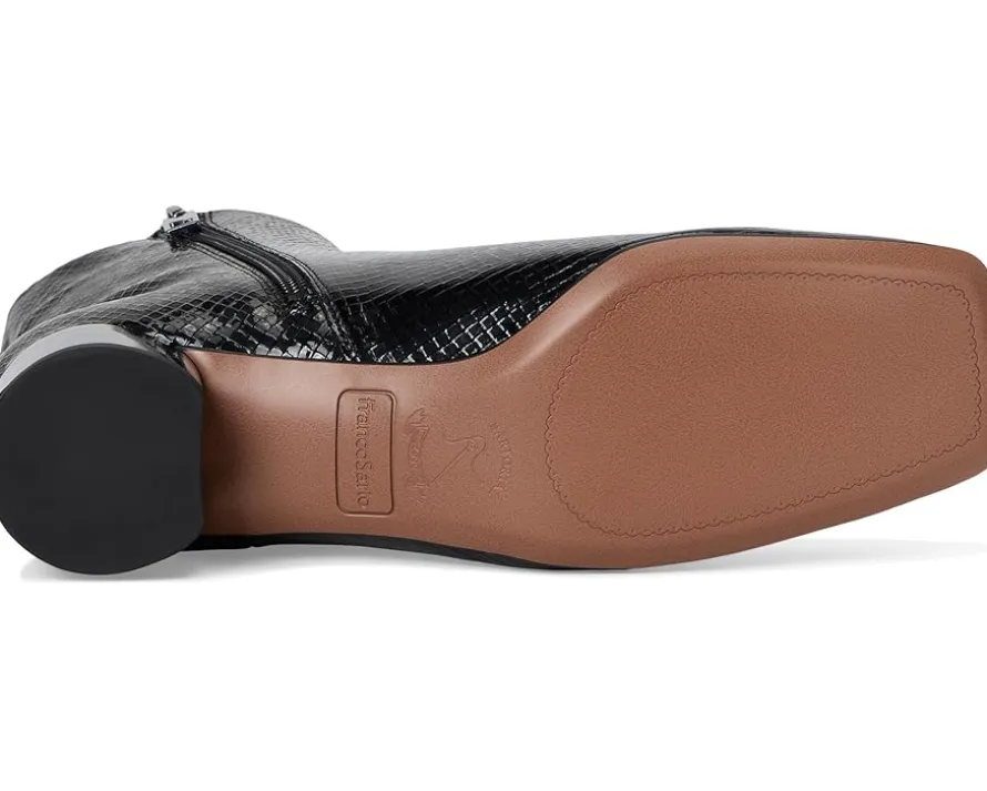 - The Franco Sarto® Noah boots blend a modern silhouette with timeless Italian craftsmanship. These heeled booties are designed with a faux leather upper that is made from partially recycled materials and styled with a metallic ornament. The foam insole and polyurethane lining keep your feet cool and comfortable. These ankle booties feature a zippered side closure for easy on and off. Perfect to wear to work, office, events, and parties, these pull-on boots make a great addition to your footwear collection.