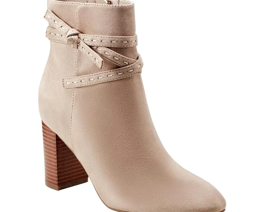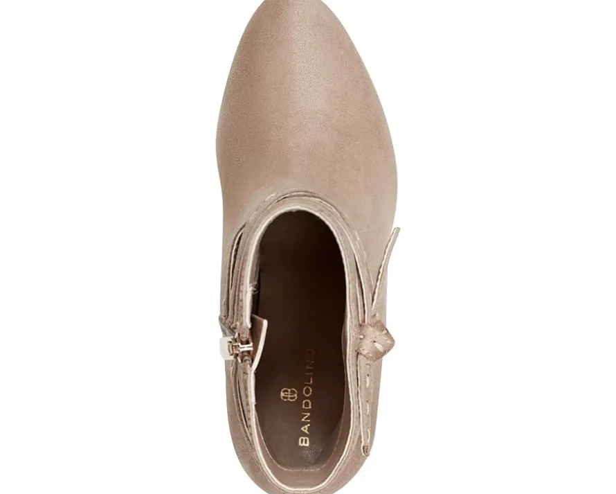 - The Bandolino® Ocorn is designed to make every moment graceful yet chic. Outfitted with a stacked block heel, this ankle bootie is styled with multiple straps and a side knot detail. The faux suede upper is accompanied by a side zipper for easy entry.