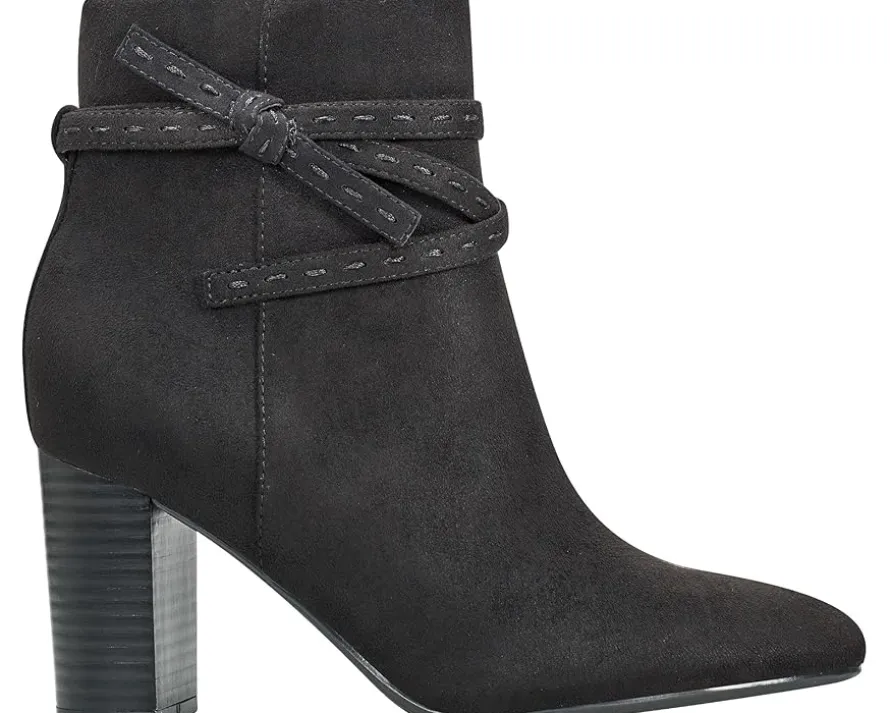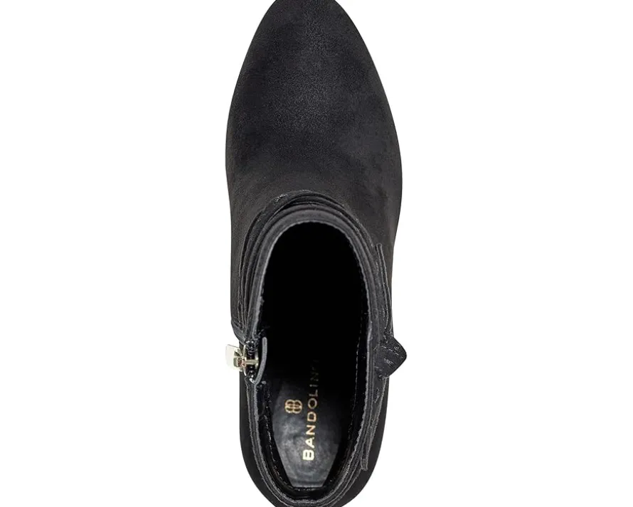 - The Bandolino® Ocorn is designed to make every moment graceful yet chic. Outfitted with a stacked block heel, this ankle bootie is styled with multiple straps and a side knot detail. The faux suede upper is accompanied by a side zipper for easy entry.