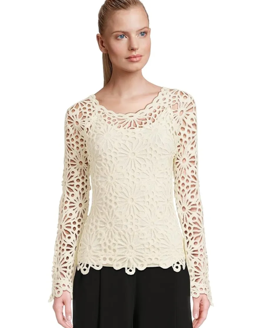 - The Norma Kamali® Off Shoulder Raglan Top adds a touch of romance with its semi-sheer fabric, off-the-shoulder neckline, and intricate floral crochet detail. Long sleeves complete this elegant design, perfect for chic layering or standalone style.