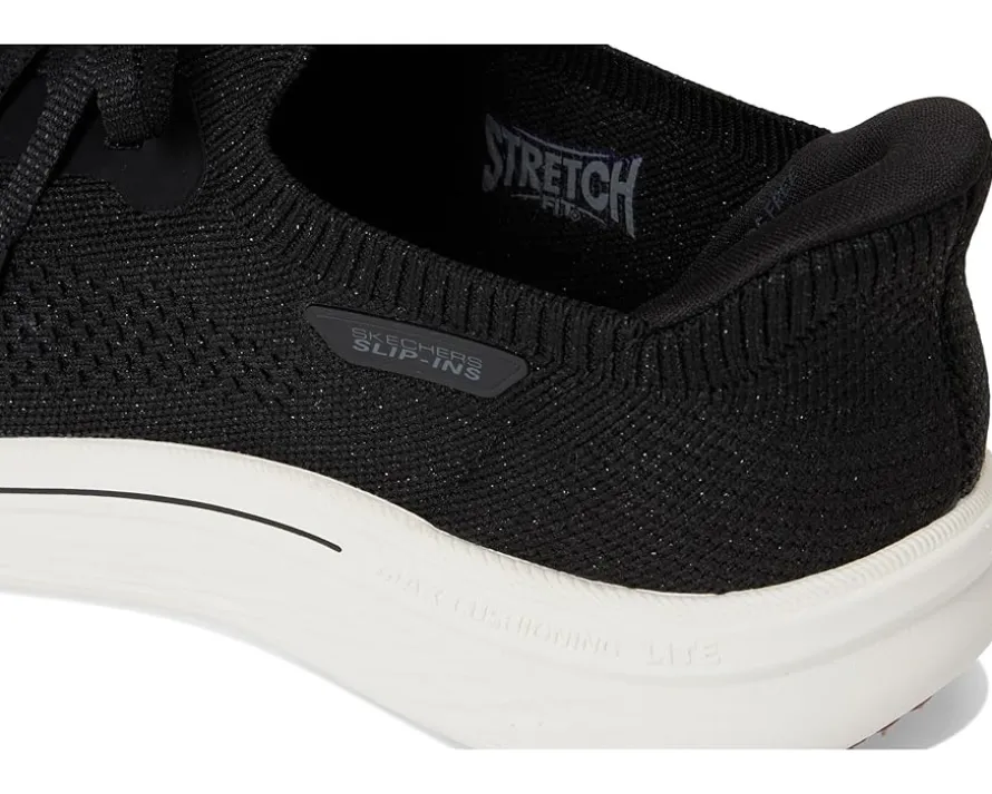 - Style it sporty or street-chic, On-the-go Hands Free Slip-ins Max Cushioning Lite Aura – Quinn by SKECHERS® Performance brings the glow to wherever you go. Designed with an easy pull-on style and fixed laces, this sneaker features the exclusive Hands Free Slip-ins™ with a secure Heel Pillow™ that hugs your heel for a snug, no-fuss fit. The breathable metallic knit upper pairs perfectly with our ULTRA GO® midsole for high-rebound, responsive comfort. Featuring a lightweight EVA insole and outsole and a lower-profile Max Cushioning Lite Aura design, these sneakers deliver athletic performance with sleek, casual style.