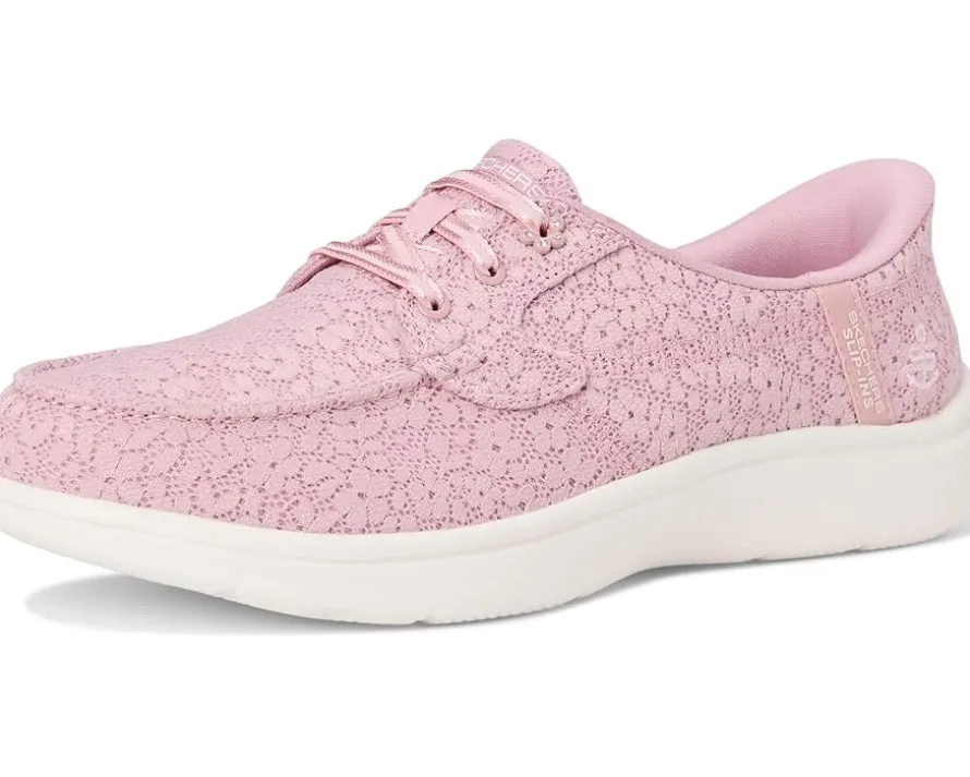 - Stylish and versatile comfort combine in the SKECHERS® Performance On-The-Go Hands Free Slip-Ins On-The-Go Flex Radiant – Leilani. Designed with an exclusive Heel Pillow™, this boat style features a floral lace upper with stretch laces, high-rebound Skechers Air-Cooled Goga Mat™ insole, and lightweight ULTRA GO cushioning.