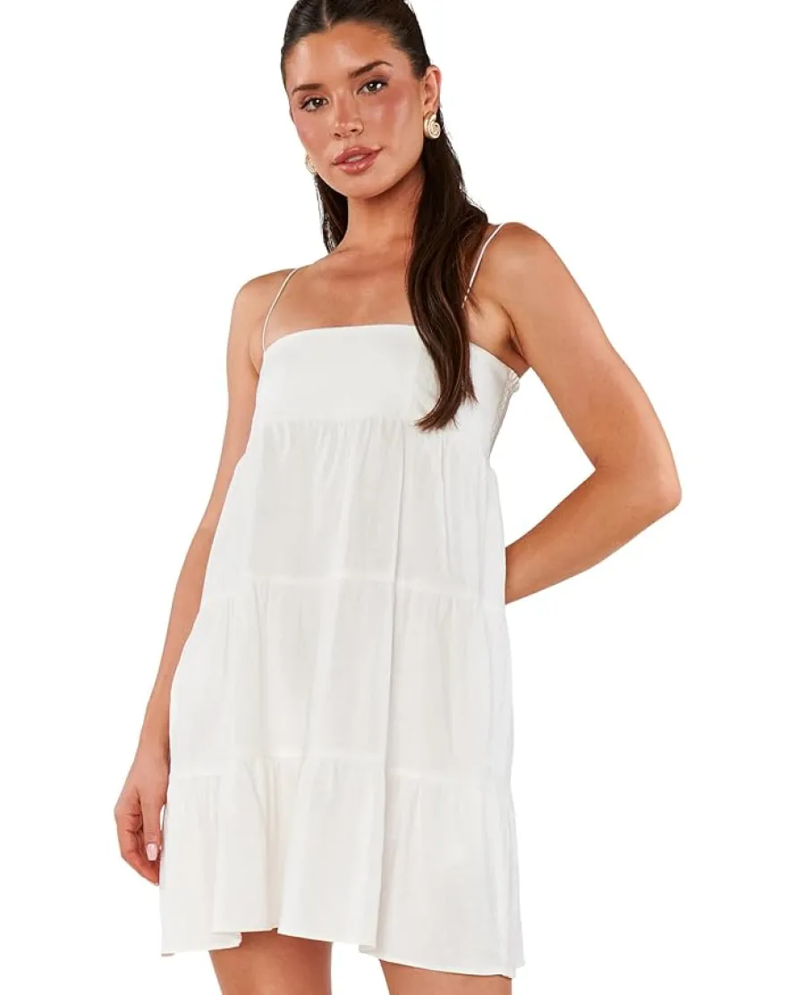 - Wear this next time you’re OOO! In subtle Sand Shells Gauze, this Show Me Your Mumu™ Ooo Mini Dress neutral little mini is your throw on dress for vacay, or nice warm days! Has spaghetti straps with a tiered body. This dress features square neckline, sleeveless style, smocked back, pull-on style, and short length.