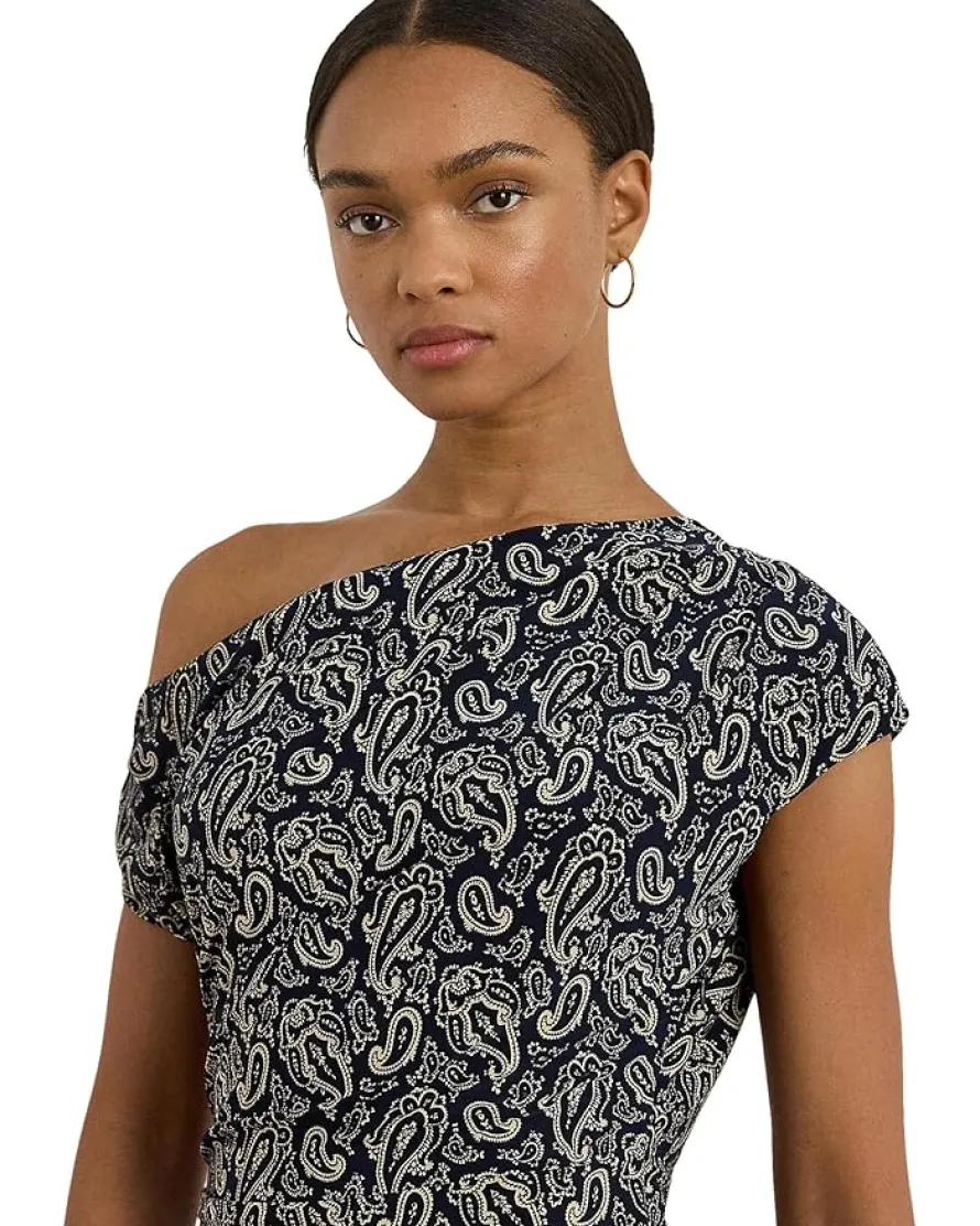 - Delicate pleating enhances the graceful off-the-shoulder silhouette of this Lauren Ralph Lauren® Paisley Jersey Off-The-Shoulder Dress, which is rendered in stretch jersey for ease of movement. This sheath dress depicts an enchanting paisley pattern in hues of blue and cream. Fully lined, it is styled with an asymmetrical off-the-shoulder neckline, a straight hem, and a concealed zippered side closure. The pleats gathered at the shoulder seams add to its style.