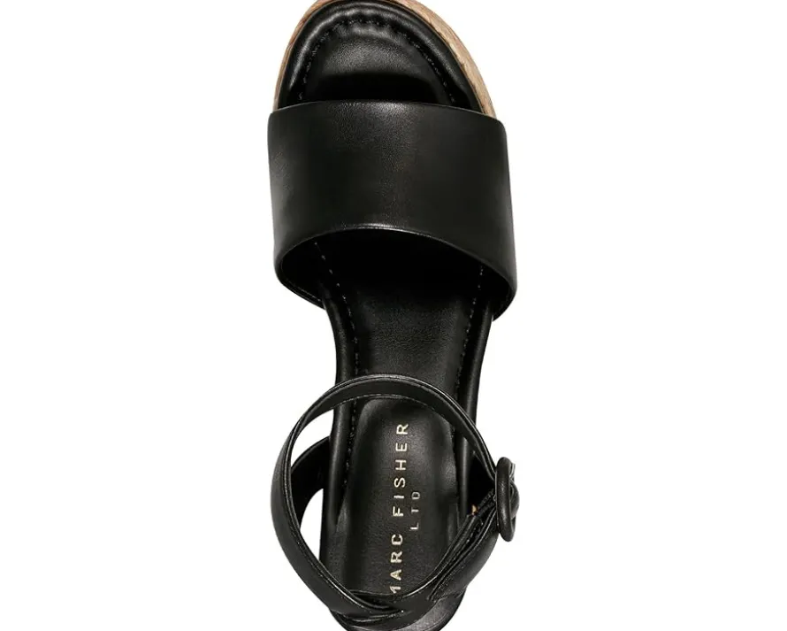 - Bring in the sleekness with sculpted flair wearing Marc Fisher LTD™ Palyca Sandals. The high-block heel footwear features woven construction with leather upper and buckled ankle strap closure.