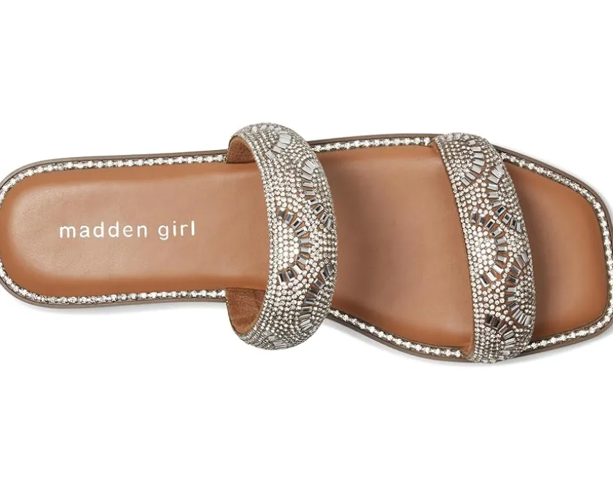 - The Madden Girl® Partly is a flat sandal favorite, featuring a flat heel, squared open toe and slip-on closure. It is designed with microsuede upper material and rhinestone embellishments.