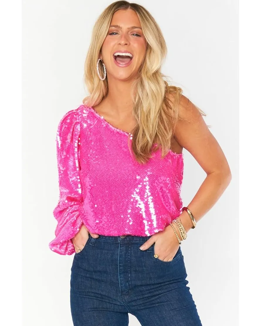 - Radiate glamor by styling this one-shoulder sparkling Show Me Your Mumu™ Party Top. This sequin top has an asymmetrical neckline and a long puff sleeve on the right side.