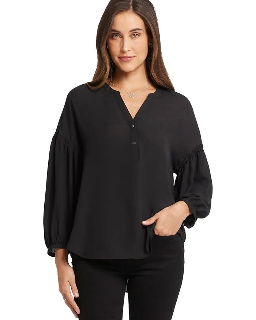 - Look gorgeous and get loads of compliments wearing the NYDJ® Paulina Peasant Blouse. Crafted in a regular-fit silhouette, the top features a slit neckline with half-button closure, three-fourth puff sleeves, intricate embroidery, and a curved hem.