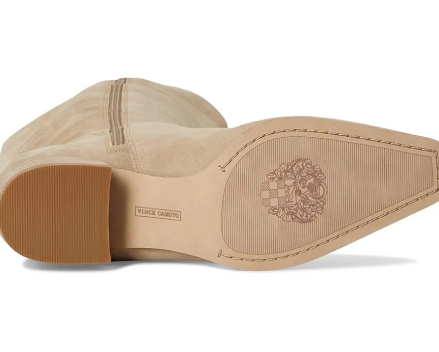 - The Vince Camuto® Pavla Knee High Boots exude effortless sophistication. Crafted from Verona suede, these heeled boots showcase a refined silhouette with a pointed toe shape and a subtly structured shaft. Their low stacked block heels offer both style and comfort, and the full-length zippered side closure makes for easy entry. They are made of a polyester insole and fabric lining. Whether paired with tailored trousers or a chic dress, these knee-high boots add a polished touch to any outfit.