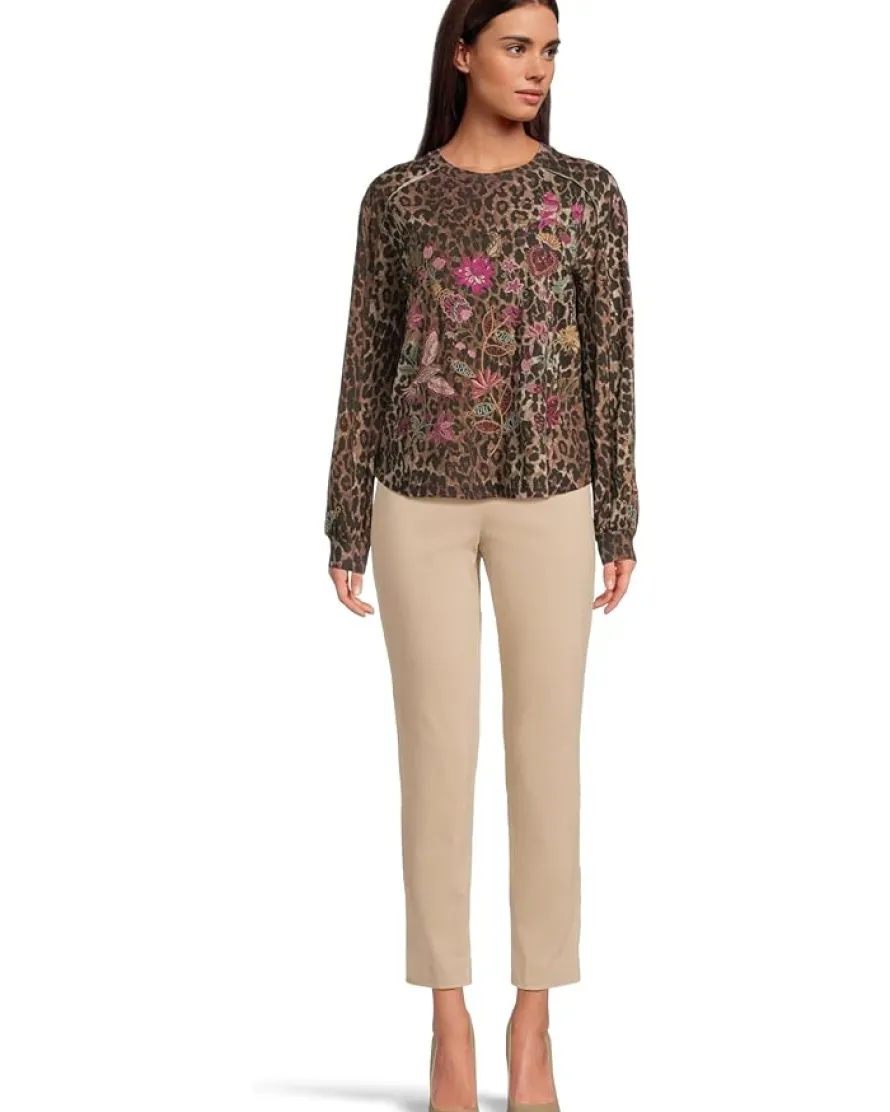 - Wildly chic and effortlessly feminine, this embroidered leopard-print pullover blends bold animal print with vibrant floral detailing for a look that’s both fierce and romantic. Crafted from soft, luxurious fabric, it’s the perfect statement piece for adding a touch of boho elegance to your everyday style.