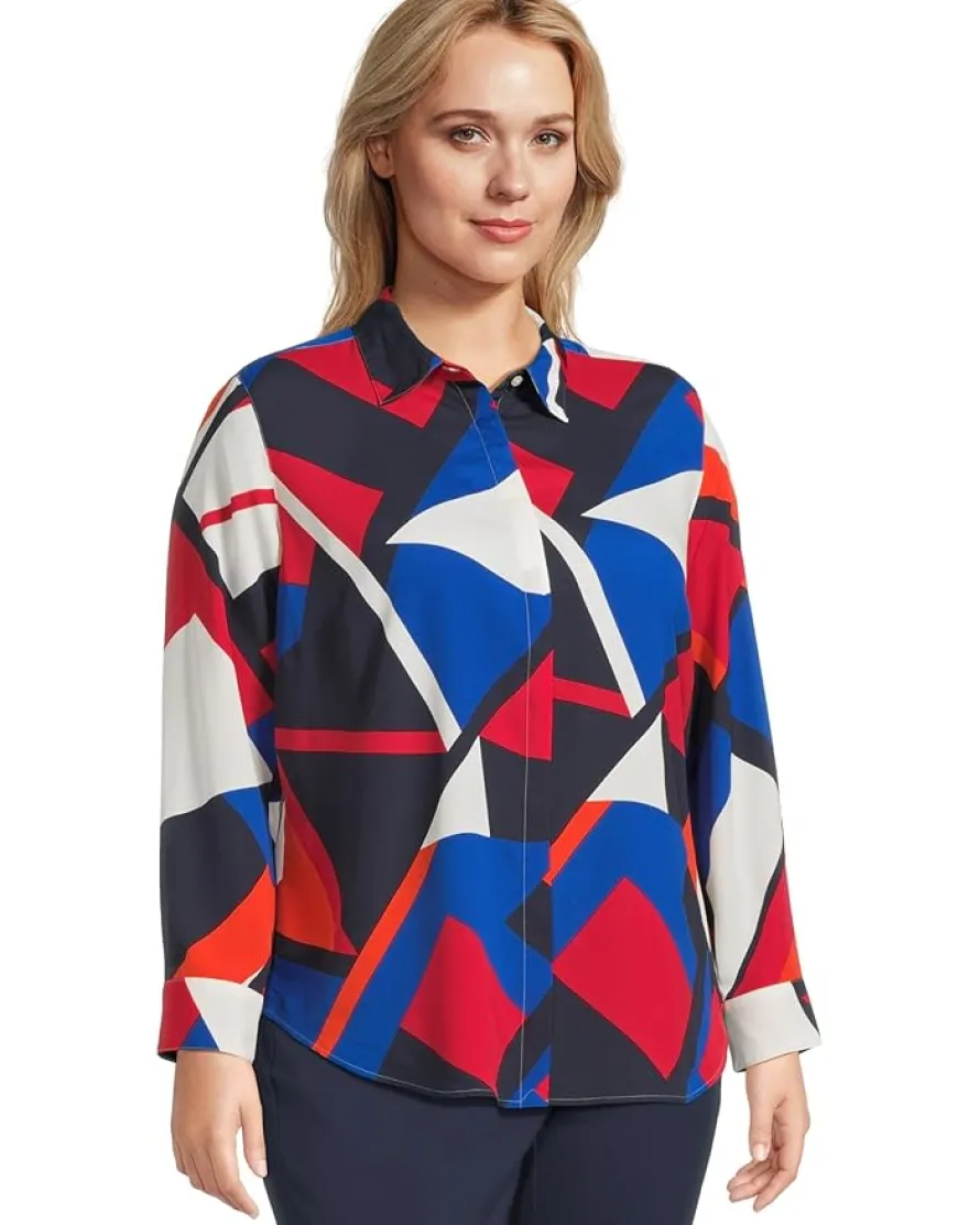 - Crafted from airy crepe de chine, the Lauren Ralph Lauren® Plus Size Classic Fit Print Crepe Shirt combines sophistication with comfort. Featuring a graceful sailboat-inspired abstract motif, it boasts a point collar, concealed button placket, and engraved buttons for refined detailing. The straight fit, shirttail hem, and back yoke ensure a polished silhouette, while the lightweight fabric drapes beautifully at the hip. Long sleeves with buttoned barrel cuffs add versatility, making it perfect for work or weekend adventures.