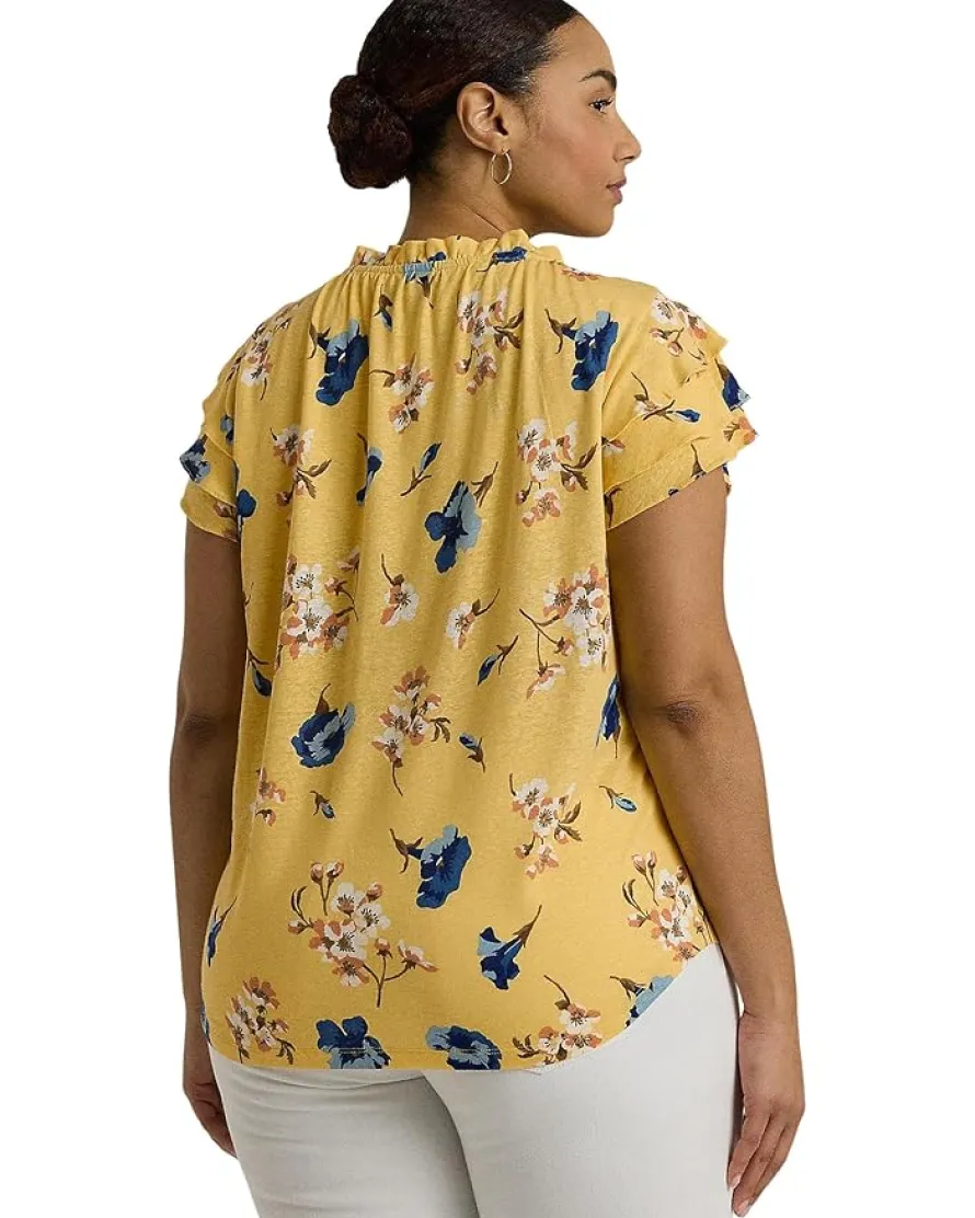 - Set the fashion tone in your graceful allure wearing LAUREN Ralph Lauren® Plus-Size Floral Linen-Blend Jersey Tie-Neck Top. Crafted from lightweight linen-blend jersey, the floral print top features ruffled collar with tie-neck keyhole front detail, short layered flutter sleeves, and shirttail hem.