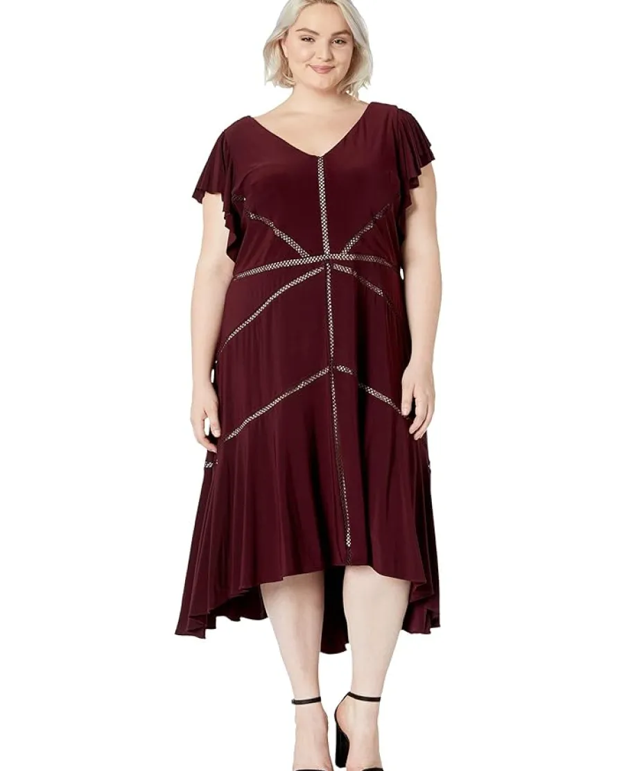 - Your fun and flirty style is sure to be a hit when wearing this Taylor™ Plus Size Ruffle Sleeve Solid High-Low Dress with perforated trim throughout.