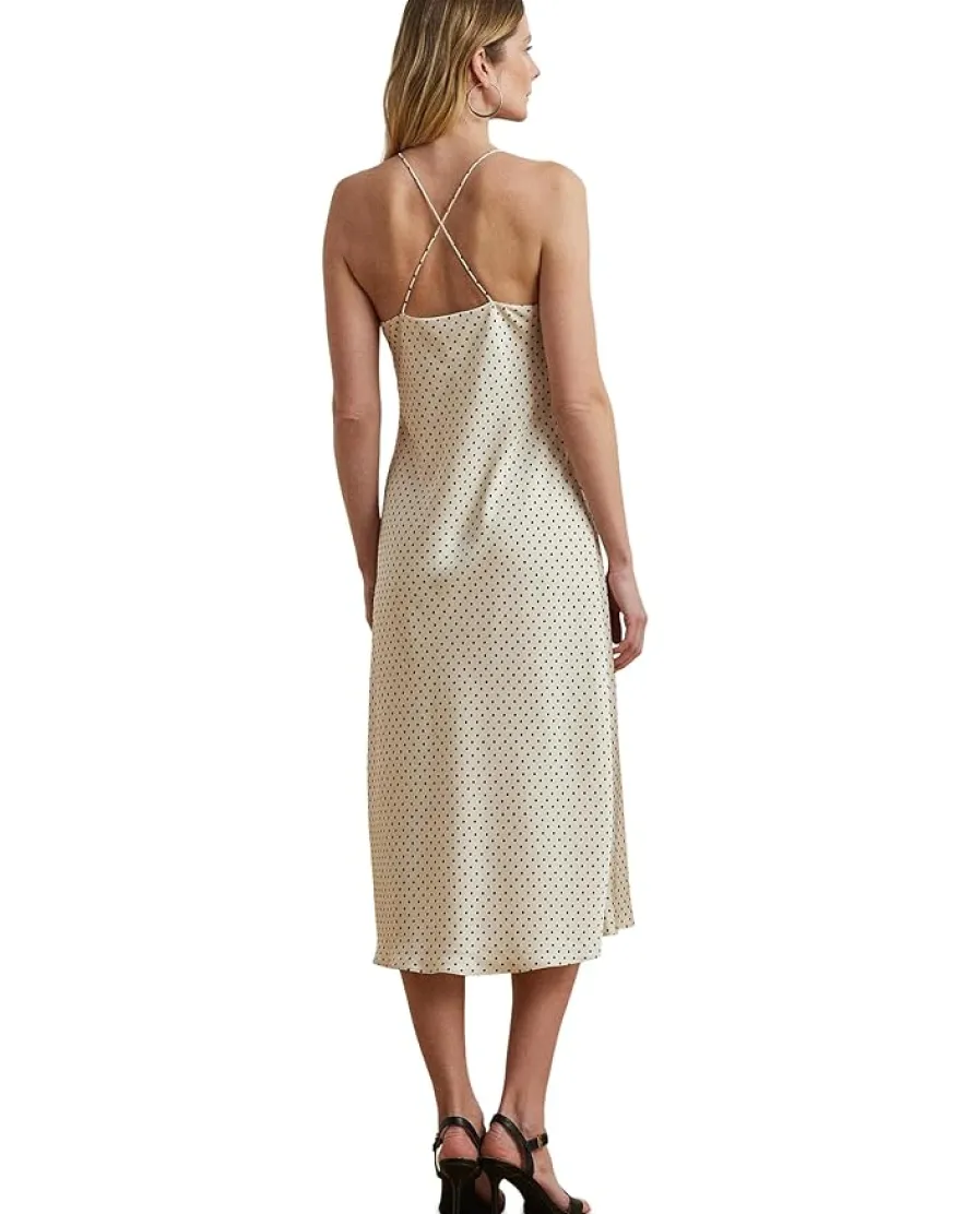 - Designed with crisscross spaghetti straps for a contemporary touch, the Lauren Ralph Lauren® Polka-dot Satin Charmeuse Slip Dress is realized in featherweight satin charmeuse for a glossy sheen and an airy feel. A slit at the skirt offers ease of movement while the allover polka dot print adds to its style. This printed dress is styled with a sleeveless silhouette. a V-neckline, and a straight hem.