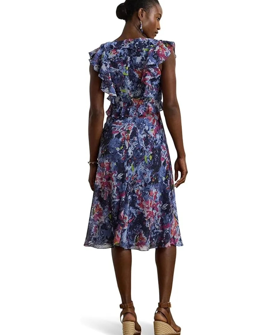 - Gracefully designed to capture attention, the Lauren Ralph Lauren® Print Ruffle-Trim Georgette Midi Dress is your go-to for effortless sophistication. Crafted from airy crinkle georgette, this dress dances with every step, thanks to flutter sleeves and delicate ruffle trims that bring the romance. The painterly abstract motif adds a modern artistic touch, while the A-line silhouette flatters with feminine ease, skimming just below the knee. Thoughtful details-like the ruffle-trimmed empire waist, V-neckline, and princess seams-highlight the bodice with soft structure. A concealed zipper back closure and hook-and-eye closure ensure a sleek fit, and the fully lined design (excluding sleeves) keeps it breezy yet refined.