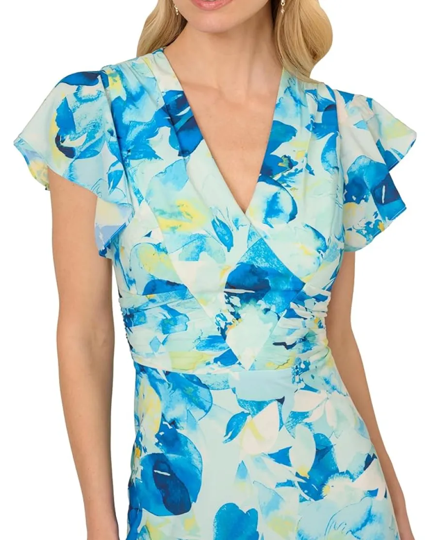 - Flow through life in style wearing the Adrianna Papell® Printed Flutter Ankle Dress. This printed flutter ankle dress features V-neckline, flutter sleeves, blouson silhouette, zippered closure, and it is intended to hit below the knee.